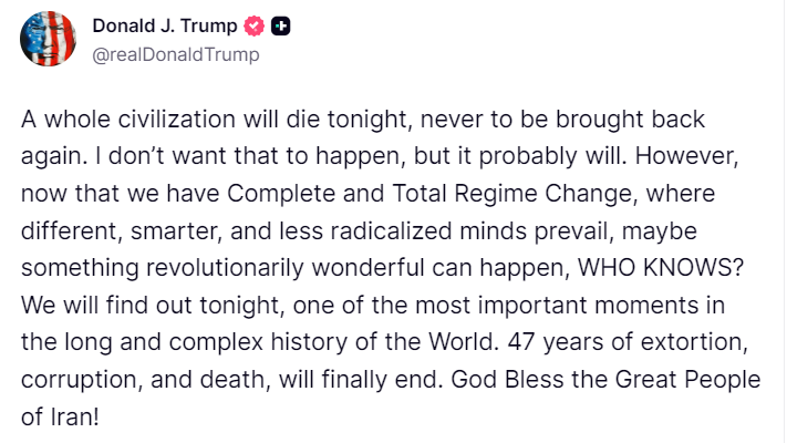 도널드 트럼프 대통령은 트루스 소셜(Truth Social)을 통해 “오늘 밤 한 문명이 완전히 멸망하고 다시는 되살아나지 않을 것”이라고 직접적인 경고를 했습니다. 그는 그러한 결과를 원하지 않지만, 이란이 호르무즈 해협을 재개방하고 제시된 조건을 수용하라는 오후 8시 시한을 지키지 않으면 그런 일이 벌어질 것이라고 예상한다고 밝혔습니다.